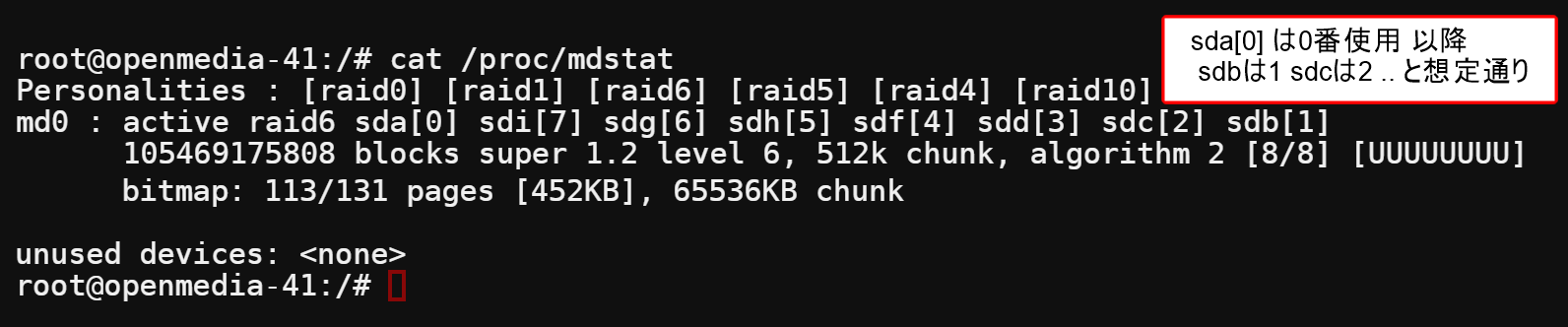 実際の作成、確認の様子です。この時は sda 〜 sdi すべて記入したみたいですね (^0^)