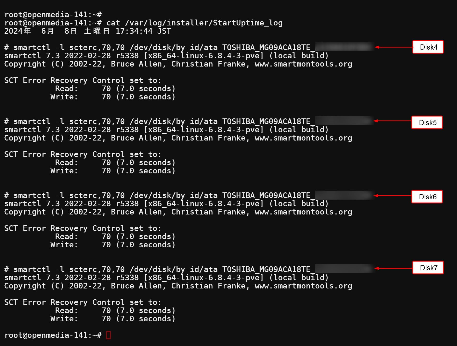 StarUptime.sh に Timeout Mismatch 対策を追加します。Timeout Mismatch の説明は何度もしていますので、OpenMediaVault6 (OMV6) で作る PC2台連携 48TB RAID Z2 システム【Part 1】 を参考にして下さい。StarUptime.sh を