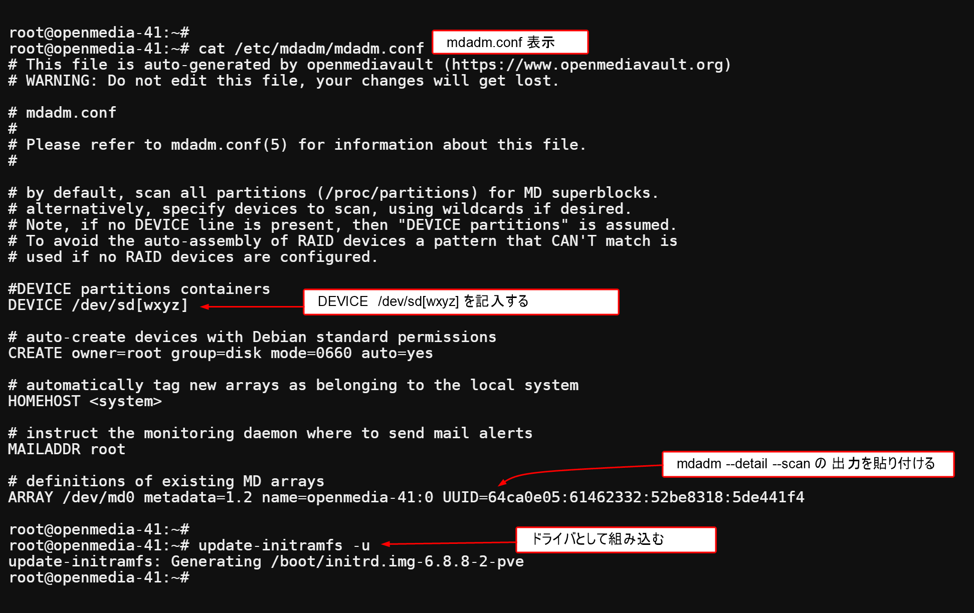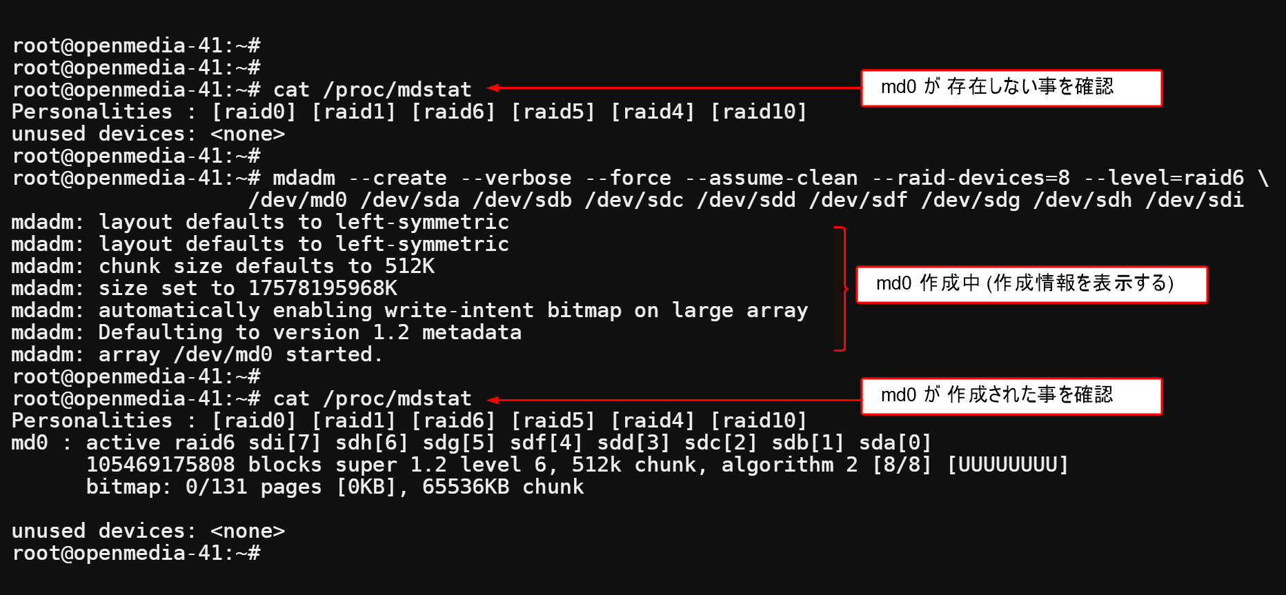 を実行しておきましょう。mdadmドライバ不活性化の確認は 再起動時のRAID環境の再構築でやります。
