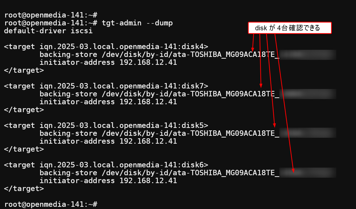 その時の tgt-admin –dump です。ちゃんとディスクが 4台見えますね。